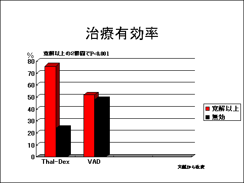 | 今月のEBM,ナウ(13) 治療法の新旧交代? {文献要約}多発性骨髄腫に対する従来の点滴の抗がん剤から内服薬への変更の可能性を示唆したイタリアからの報告。しかも、その内服薬はサリドマイド。解析方法は1996年から2004年までの後方視的研究。100例のサリドマイド-デキサメサゾン療法(Thal-Dex)と100例のvincristine-doxorubicin-dexamethasone(VAD)療法2群を年齢、臨床病期、血清β2-ミクログロブリン値で症例背景をmatchingさせて比較検討した。治療の詳しい内容は省略するが、サリドマイドは内服14日間、VADは24時間持続点滴で4日間。治療有効性は部分寛解以上が、76%と52%(P<0.001)。毒性ではVADに12%の骨髄毒性(grade3-4)が見られたが、Thal-Dexでは0%。深部静脈血栓症がThal-Dexの15%に合併するも,VADでは2%。 ![]() 結論:サリドマイド-デキサメサゾンはVAD療法に代わるものとなる。 文献:Cavo M et al. Superiority of thalidomide and dexamethasone over vincristine-doxorubicin-dexamethasone (VAD) as primary therapy in preparation for autologous transplantation for multiple myeloma. Blood. 2005; 106:35-39. |