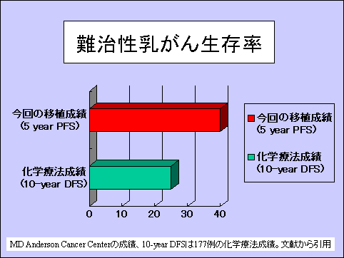 難治性乳がん(術前の化学療法無効例)治療法として自家末梢血幹細胞移植の報告。1997年から2002年に60歳以下、年齢の中央値は46歳で、42例の難治性乳がん女性に対して自家移植を施行。29例は移植前に手術を受けた。移植後60日の評価では30例の完全寛解、8例に部分寛解、1例はminor responseそして3例は病状進行。特記すべきは自家移植前に手術困難の13例中、7例は移植後に手術が可能となった事。追跡中央値42ヵ月現在で21例が生存、15例は病状の悪化なし。5年無病状進行生存率(PFS)は40%。下図に示すように、同施設の過去の成績として、移植施行してない群の10年無病生存率(DFS)は25%。